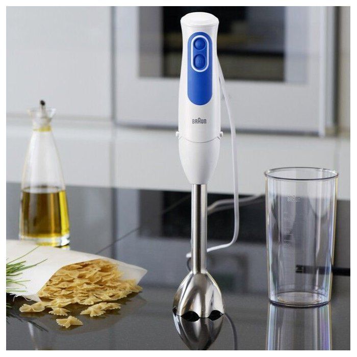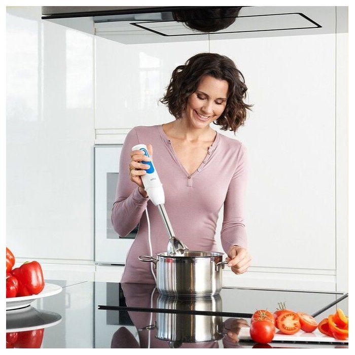 The BRAUN MQ3005WH is an immersion blender designed for a variety of food preparation tasks. It features a powerful 750 W motor that enables efficient blending and mixing. The blender is designed in a sleek white and blue color scheme, making it an attractive addition to any kitchen. It is compact and lightweight, allowing for easy handling and storage. The product includes an array of accessories to enhance its functionality, making it suitable for diverse culinary applications. This immersion blender is ideal for preparing soups, sauces, and smoothies, making it a versatile tool for everyday cooking.