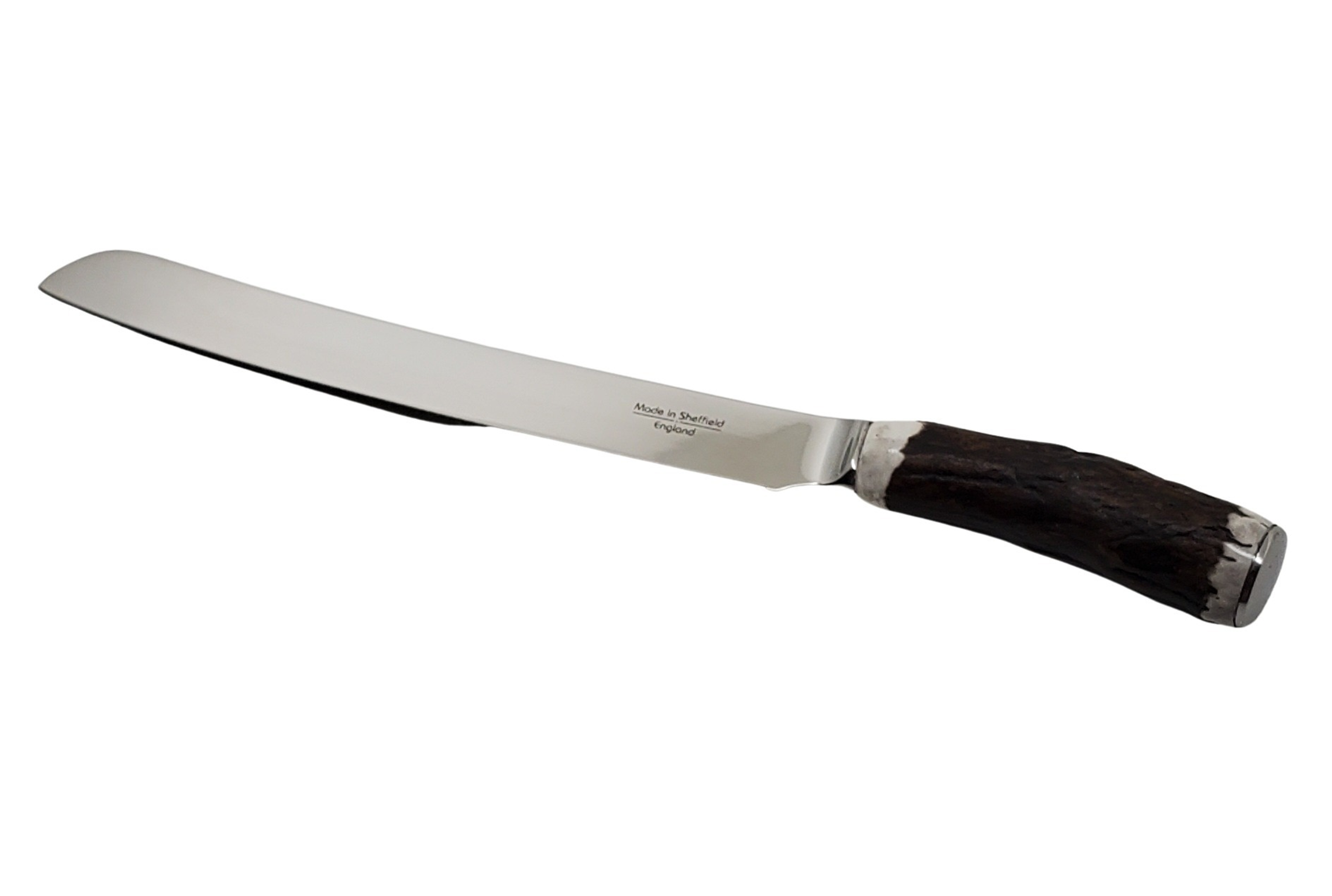 The 12-inch bread knife features a stainless steel blade designed for slicing through crusty loaves with ease. Its handle is made from naturally shed horn, providing a unique and ergonomic grip for comfortable use. This knife is ideal for both home cooks and professional chefs who need a reliable tool for cutting bread. Measuring 12 inches in length, it offers sufficient reach to handle larger loaves. The natural aesthetic of the horn handle adds an elegant touch to any kitchen setting. This knife is commonly used in culinary contexts where fresh bread is served, making it perfect for bakeries, restaurants, and home dining.