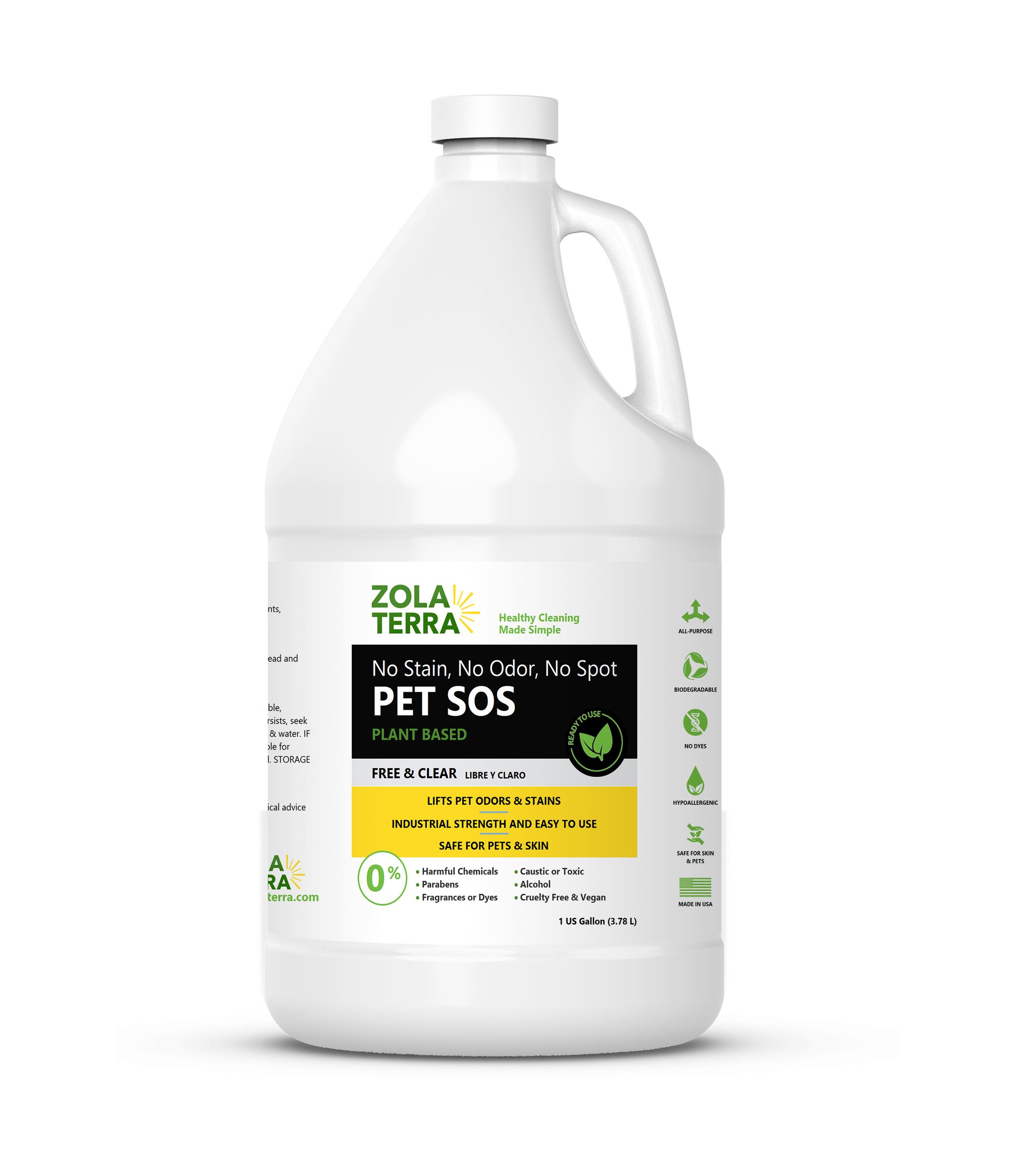 Pet SOS Cleaner is a versatile cleaning solution designed to tackle pet stains odors and spots on any surface. This plant-based formula is free from fragrances dyes and alcohol ensuring a safe environment for both children and pets. It effectively dissolves organic stains and odors while lifting them away for gentle cleaning and deodorizing. The cleaner is biodegradable non-corrosive and non-hazardous requiring no special handling or storage. Available in sizes of 16 FL OZ 32 FL OZ and 1 GAL it is perfect for home use where pet accidents may occur. To use simply spray the affected area allow it to activate for about five minutes and wipe or blot clean.