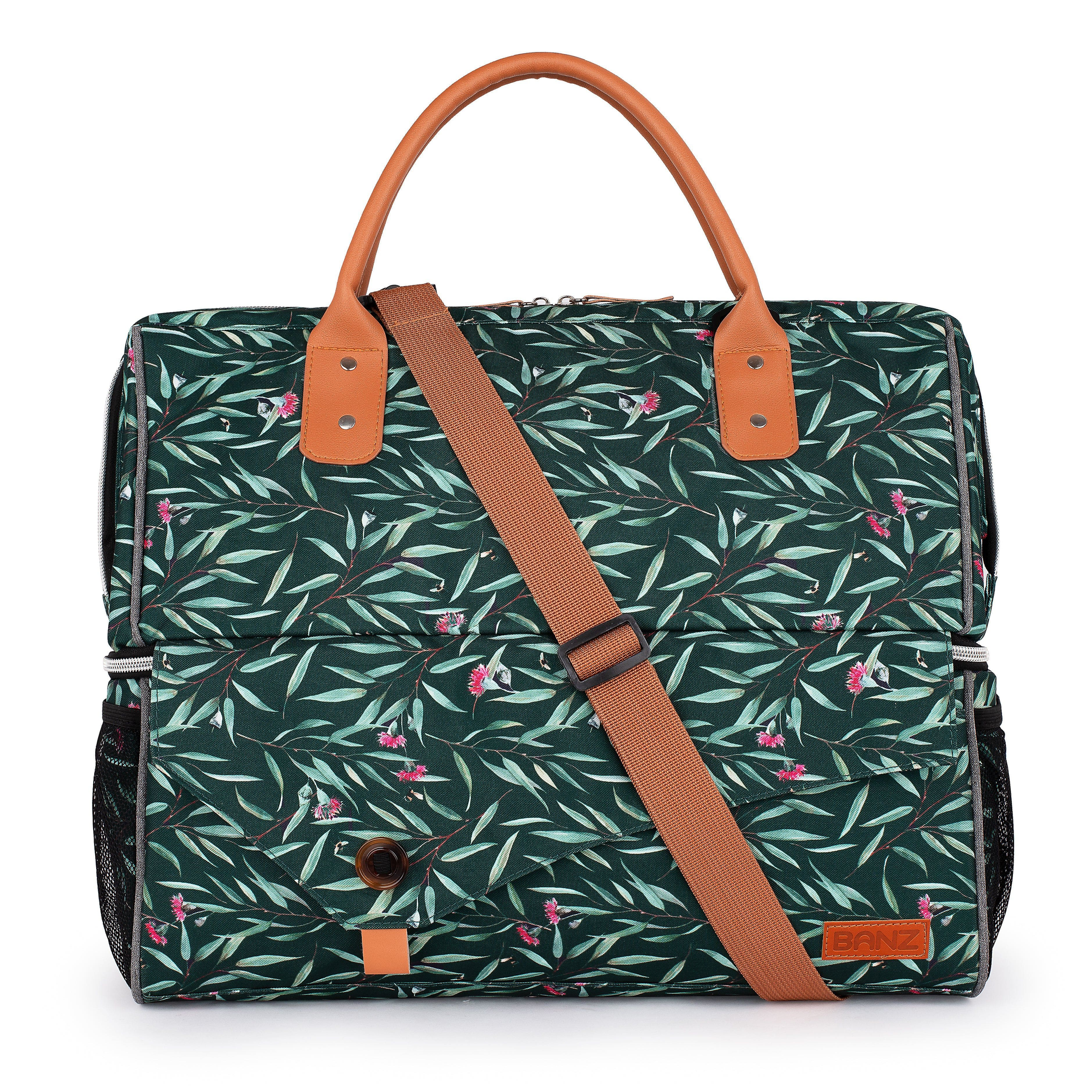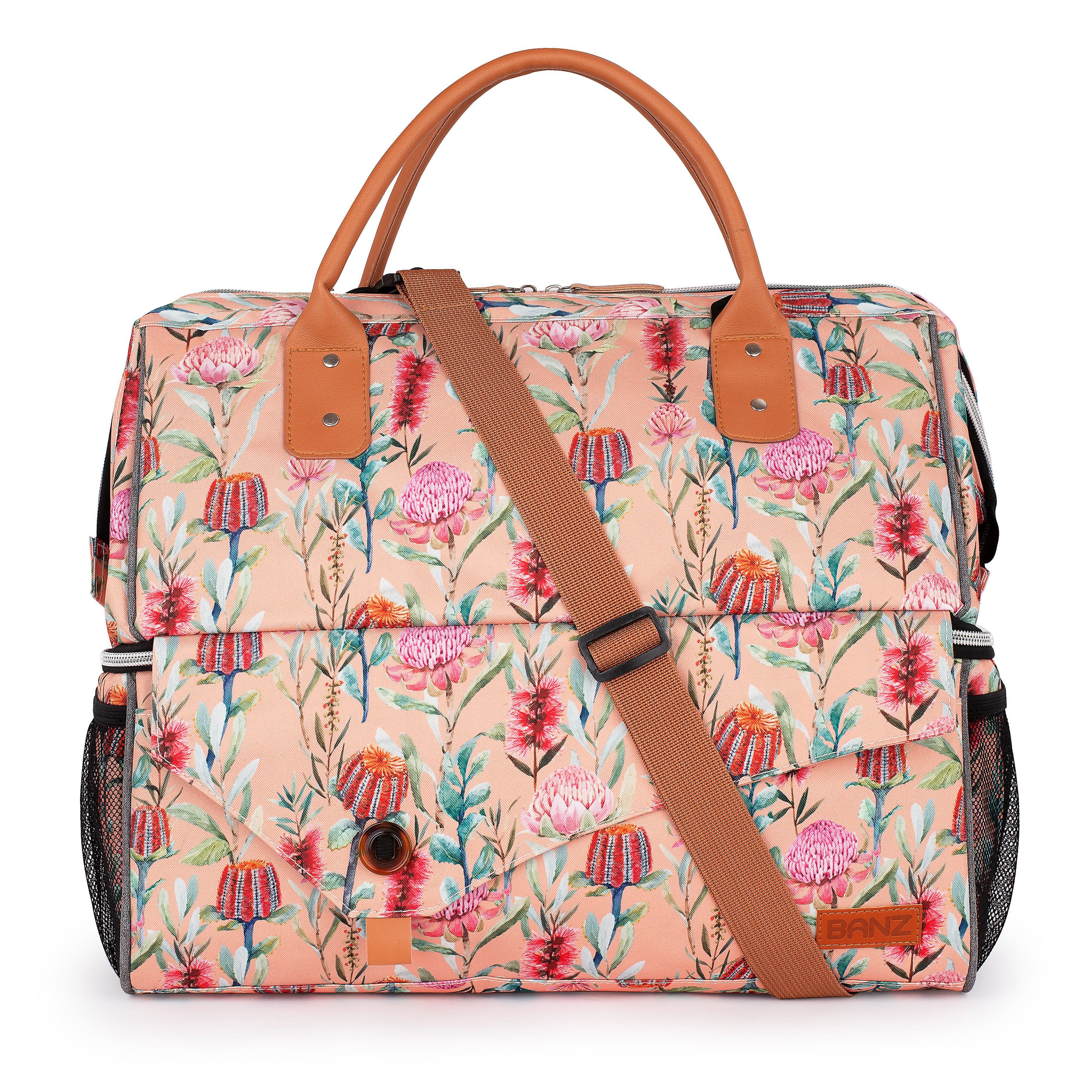 The Picnic Cooler Bag is a soft-sided carrier designed for easy transport of food and beverages, making it ideal for picnics, grocery shopping, or outdoor events. Constructed from durable dual-layered material, it ensures strength and water resistance. Featuring eco-friendly aluminum insulation, it effectively maintains food temperature and prolongs drink freshness. The bag boasts a large capacity with two insulated compartments for organized storage, complemented by extra pockets for keys and utensils. Available in exclusive floral designs inspired by native Australian flowers, it includes a faux leather handle and crossbody strap for comfort, zippers for secure closure, and is easy to clean with warm soapy water. The dimensions are 40 x 25 x 30 cm, making it a practical choice for various occasions.