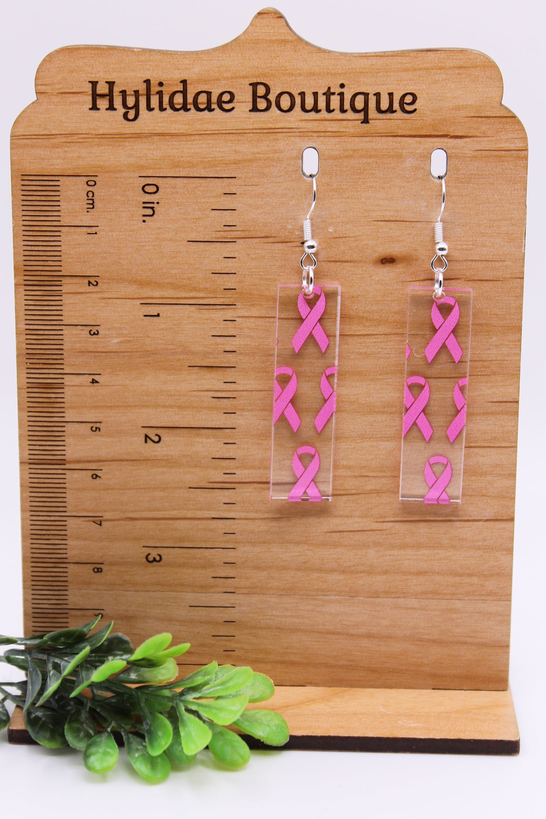 The Pink Ribbon Bars Breast Cancer Awareness Dangle Earrings are crafted from acrylic and stainless steel featuring a hook and post design with a rubber push back for a secure fit. These earrings are hypoallergenic as they are free from lead and nickel, making them suitable for sensitive skin. Hand-crafted by Hylidae Boutique, they represent a meaningful symbol of breast cancer awareness. Proper care is essential to maintain their beauty; it is recommended to remove them before showering, swimming, or sleeping. These earrings can be worn in various settings to promote awareness and support for breast cancer, making them a thoughtful accessory for events or daily wear.