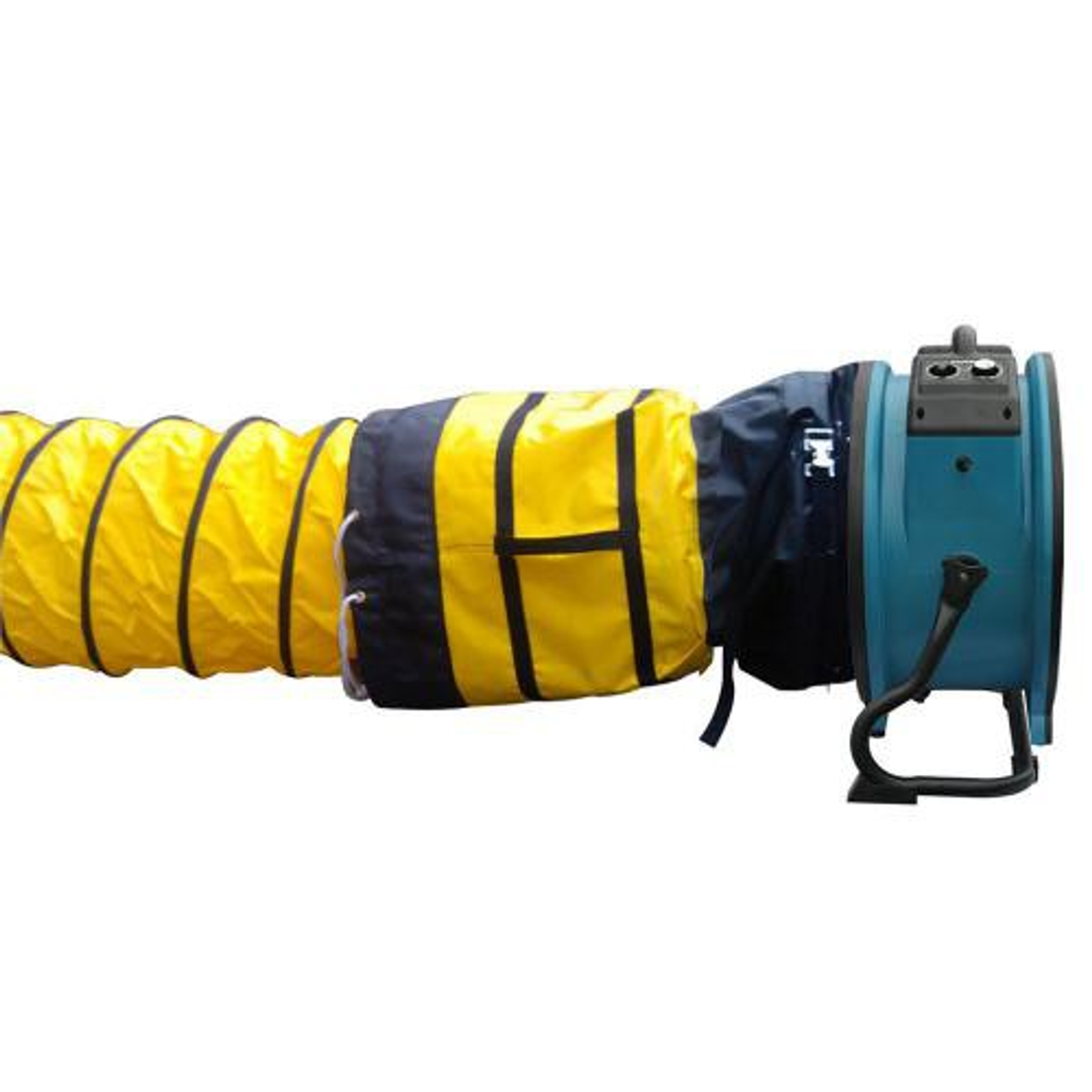 The XPOWER Extra Flexible Diameter Ventilation PVC Duct Hose is designed for various heating, air conditioning, dehumidification, blower, ventilation, and exhaust applications. This 25-foot long ducting hose has a diameter of 16 inches and is made from rugged PVC vinyl-coated polyester fabric, featuring a black external PVC strip that enhances durability against external damage. It includes an integrated spring steel wire support coil that allows for flexibility in expansion, compression, and angled turns. This hose is suitable for use in industrial, residential, and construction settings. An optional ducting hose adapter kit is available to connect the hose to specific XPOWER axial air mover blower fans.