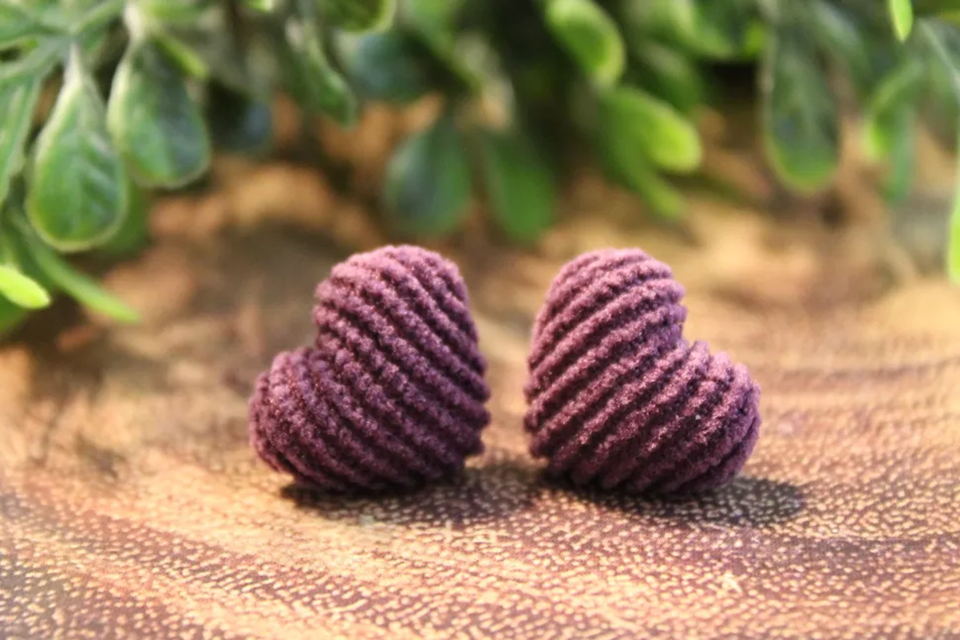 The Purple Corduroy Heart Stud Earrings are a pair of earrings designed for everyday wear and special occasions. Each earring measures 16mm and is handmade from fabric with a stainless steel bezel and post, featuring a rubber push back for secure wear. The earrings are hypoallergenic, being lead and nickel free, which makes them suitable for sensitive skin. The vibrant purple color and heart shape add a charming touch to any outfit. These earrings are perfect for gifting or enhancing your personal jewelry collection, offering a playful yet elegant accessory for various contexts and events.