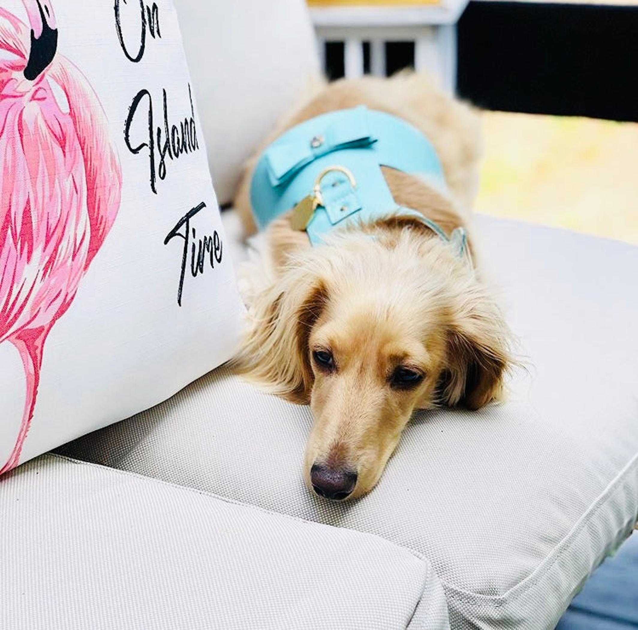 The Sunshine Babe Harness is a beautifully designed pet harness made for comfort and style. Handmade in Europe from genuine full-grain leather and suede, this harness features two adjustable buckles to ensure a perfect fit for your dog. With a unique design highlighted by a signature bow topped with a Swarovski jewel, it adds a sophisticated touch to your pet's look. Available in sizes XS to Medium, it accommodates various neck and chest measurements. For a complete look, matching accessories including a collar, leash, waste bag holder, and treat bag are available. Ideal for daily walks and special occasions, this harness combines durability with elegance.