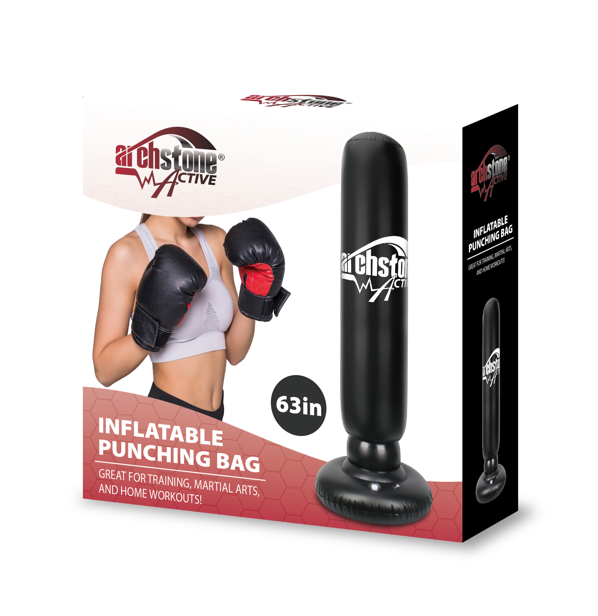 The Inflatable Punching Bag is an ideal product for boxing kickboxing martial arts cardio and conditioning workouts. Measuring 63 by 26 inches it features a durable outer layer made from eco-friendly PVC material that allows for easy cleaning. The bag can be conveniently inflated and is designed to be filled with either water or sand at the base for stability. The package includes one punching bag while boxing gloves are not included. This inflatable bag is perfect for exercise routines or simply to have something to punch, offering a versatile option for fitness enthusiasts at home or in a gym setting.