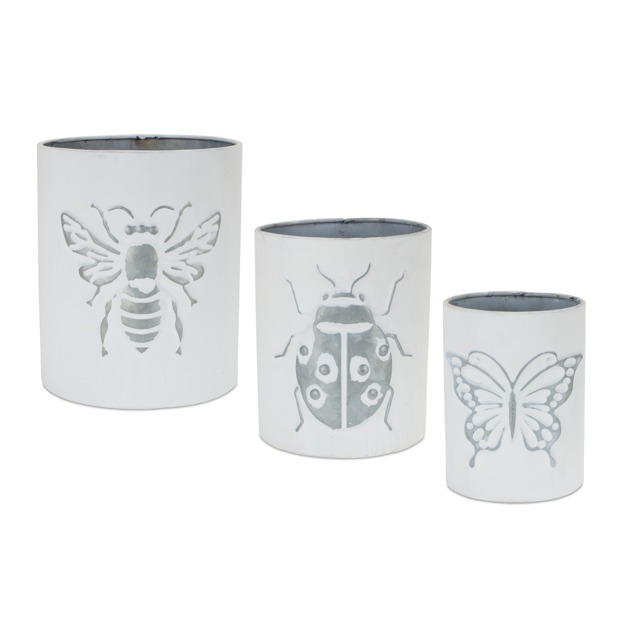 The Insect Pot Set consists of three metal pots designed to enhance indoor plants' display. The pots vary in size with dimensions of 4.5 inches in diameter by 5.75 inches in height for the smallest, 5.5 inches in height and 6.75 inches in width for the medium, and 6.5 inches in diameter by 7.75 inches in height for the largest. Made from quality terracotta clay with a striking grey and white color scheme and a white-washed finish, these pots feature charming insect accents including a bumble bee, a lady bug, and a butterfly. Ideal for showcasing potted plants or dried florals, they add a decorative touch suitable for any home decor style.