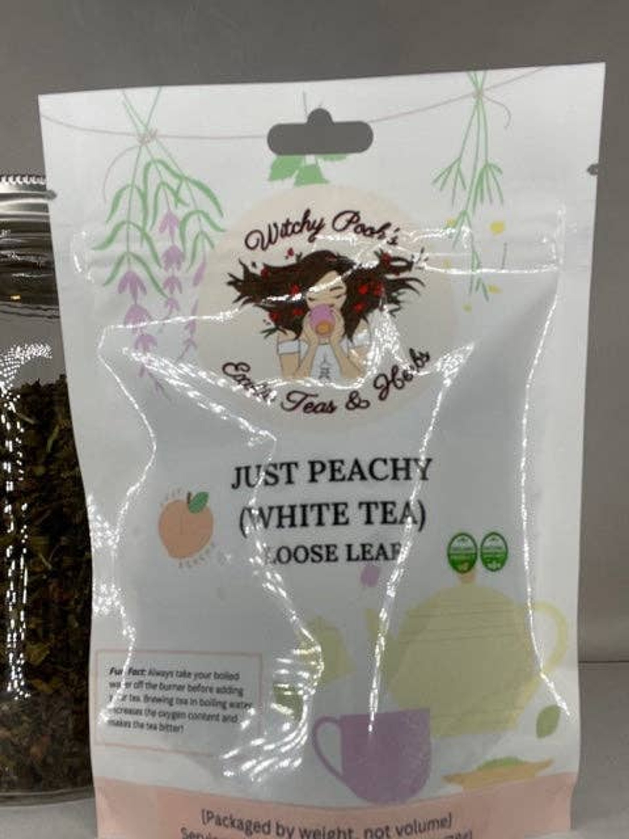 Just Peachy White Tea Loose Leaf is a delightful white tea blend that offers a mild and smooth drinking experience, enhanced by a kiss of peach flavoring. This tea is crafted from Shu Mee white tea, which brings out the delicate notes of peach without overwhelming the palate. The combination results in a refreshing beverage that is less intense than traditional black tea peach blends, making it ideal for those who prefer a lighter flavor profile. Just Peachy White Tea is characterized by its loose leaf format, allowing for a customizable brewing experience. Enjoy this tea hot during a relaxing afternoon or any time you seek a soothing moment.