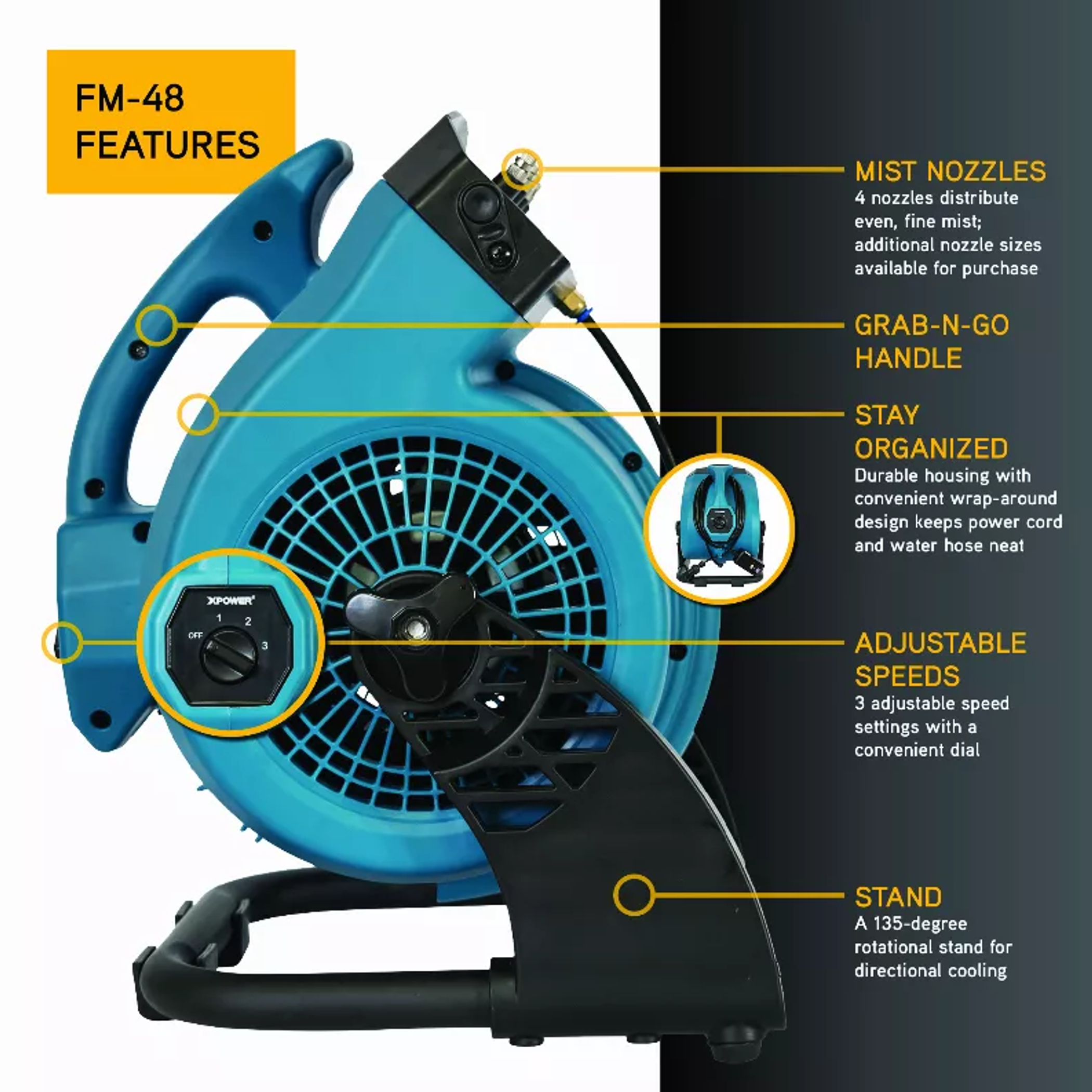The XPOWER FM-48 is a portable outdoor misting fan designed to provide comfortable cooling during hot spring and summer days. Measuring 13.30 inches in length, 12.30 inches in width, and 15.20 inches in height, this fan is easy to set up by simply plugging it in and connecting it to a standard garden hose to lower ambient temperatures by up to 30 degrees. It features a high-performance sealed motor that produces up to 600 CFM airflow and includes four nozzles for fine mist distribution over a broad area. Ideal for outdoor patios, pool areas, picnics, and sporting events, it can also be used in gardens and greenhouses to maintain plant health in challenging weather. Additionally, the FM-48 can function as a utility fan for drying and ventilation throughout the year when the misting feature is not in use.