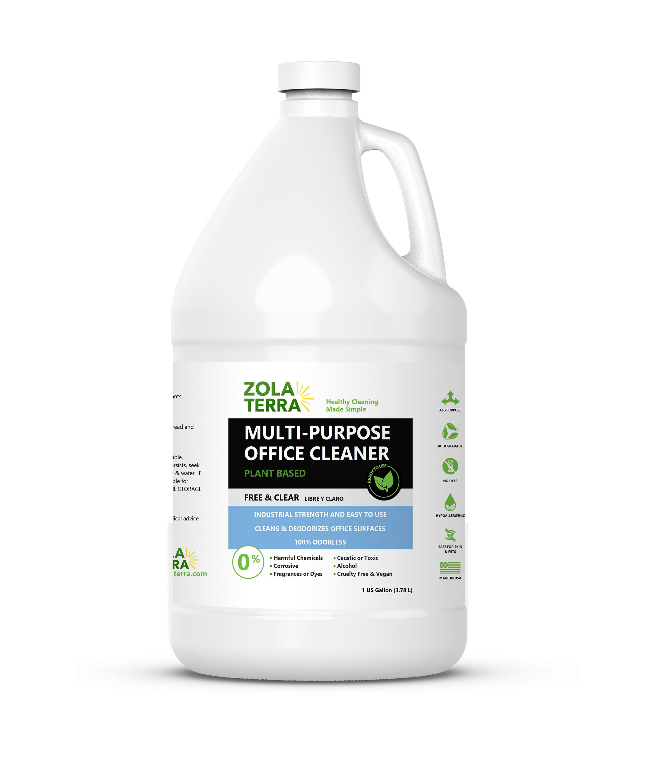 The Multi-Purpose Office Cleaner is designed to effectively clean and eliminate odors from various office surfaces including formica, granite, wood, tile, counter-tops, mirrors, linoleum, porcelain, and stainless steel. This cleaner features a plant-based formula that is biodegradable and safe for skin, children, and pets. It is free of toxic chemicals and approved for use in food preparation areas. The product is cruelty-free and made from mineral-free water combined with a proprietary blend of surfactants and plant-based solvents. Available in sizes of 16 fluid ounces, 32 fluid ounces, and 1 gallon, it is ideal for everyday cleaning tasks in office environments. To use, simply unlock the trigger, spray liberally, allow it to activate for up to 30 seconds, and wipe clean.