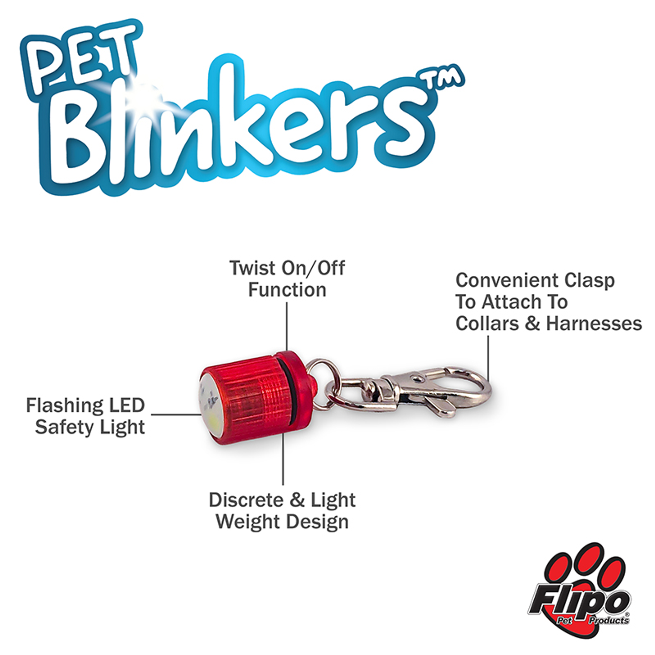Pet Blinkers are safety lights designed for pets to enhance visibility in darkness and low-light conditions. Each light features powerful LEDs that emit a bright flashing light visible up to half a mile away. Constructed from lightweight and durable plastic, they are both water-resistant and compact, making them easy to carry and attach to your pet's collar or leash. The lights operate with a simple on-off twist mechanism and are offered in four vivid colors. Pet Blinkers come with a spring-loaded clasp that accommodates various collar sizes, ensuring a secure fit for both large and small dogs. They are equipped with three AG3 batteries, including an additional spare set, making them ideal for nighttime walks or outdoor adventures.