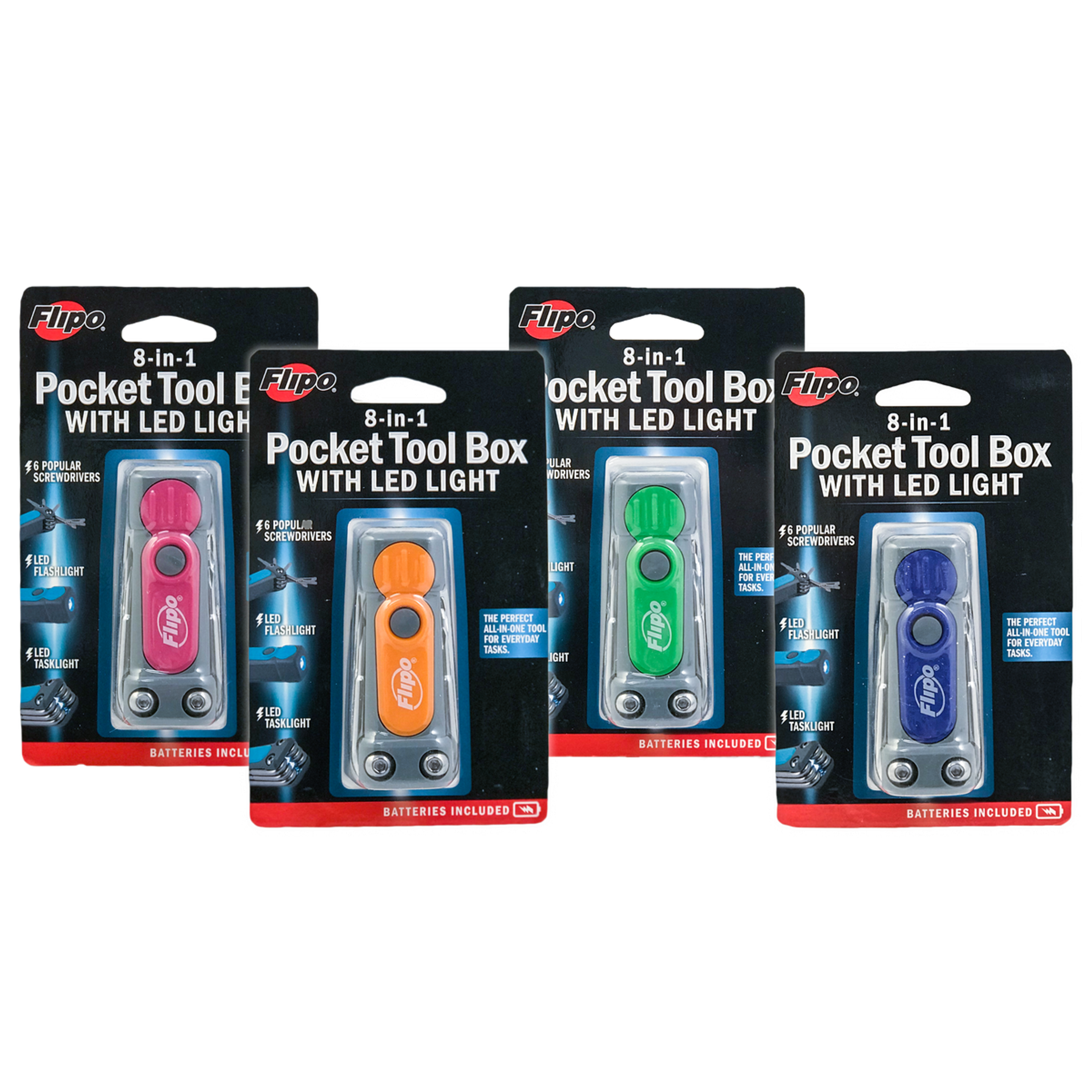 Pocket Tool Box 8-in-1 with LED Flashlight and Task Light Blue Green Orange Black Pink Compact Size 6 Screwdrivers Ideal for Everyday Tasks