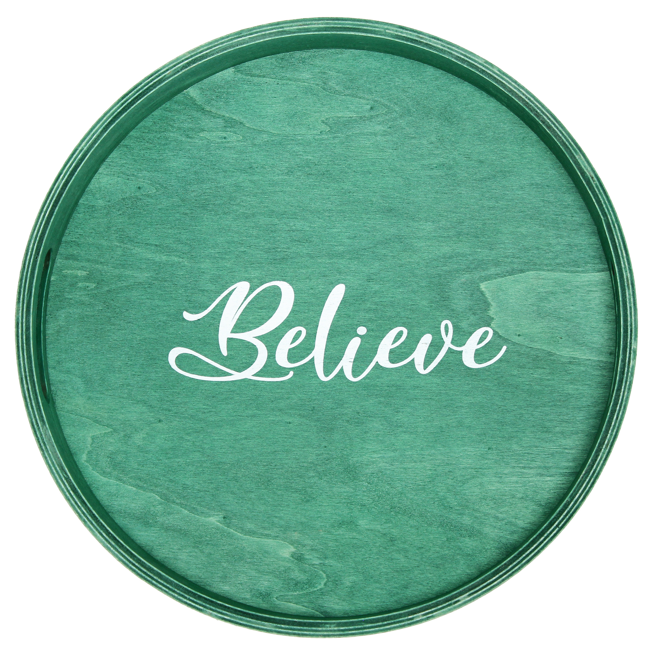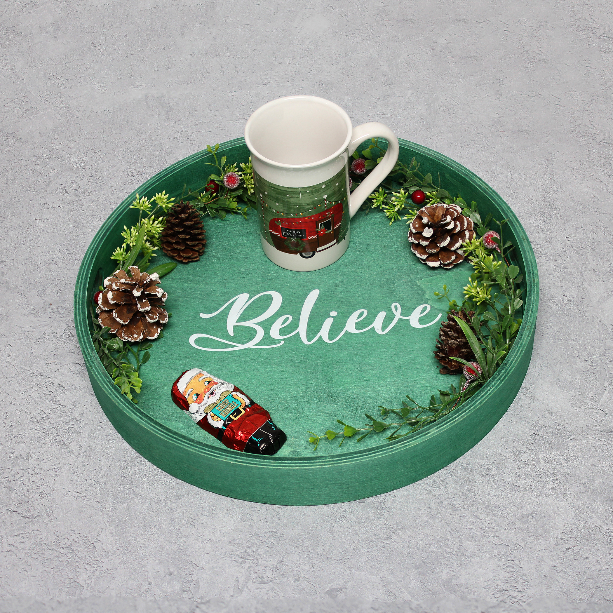 The Elegant Designs Decorative 13.75" Round Wood Serving Tray with Handles is designed to accent your home and enhance your entertaining experience. This tray features a charming green wash finish and is adorned with beautifully scripted white text that adds a thematic touch for various occasions. It measures 13.75 inches in diameter, making it a practical size for serving breakfast in bed or presenting food and drinks during gatherings. This versatile piece can also serve as an excellent centerpiece for your dining table, kitchen counter, coffee table, or ottoman, blending functionality with a cozy farmhouse style.