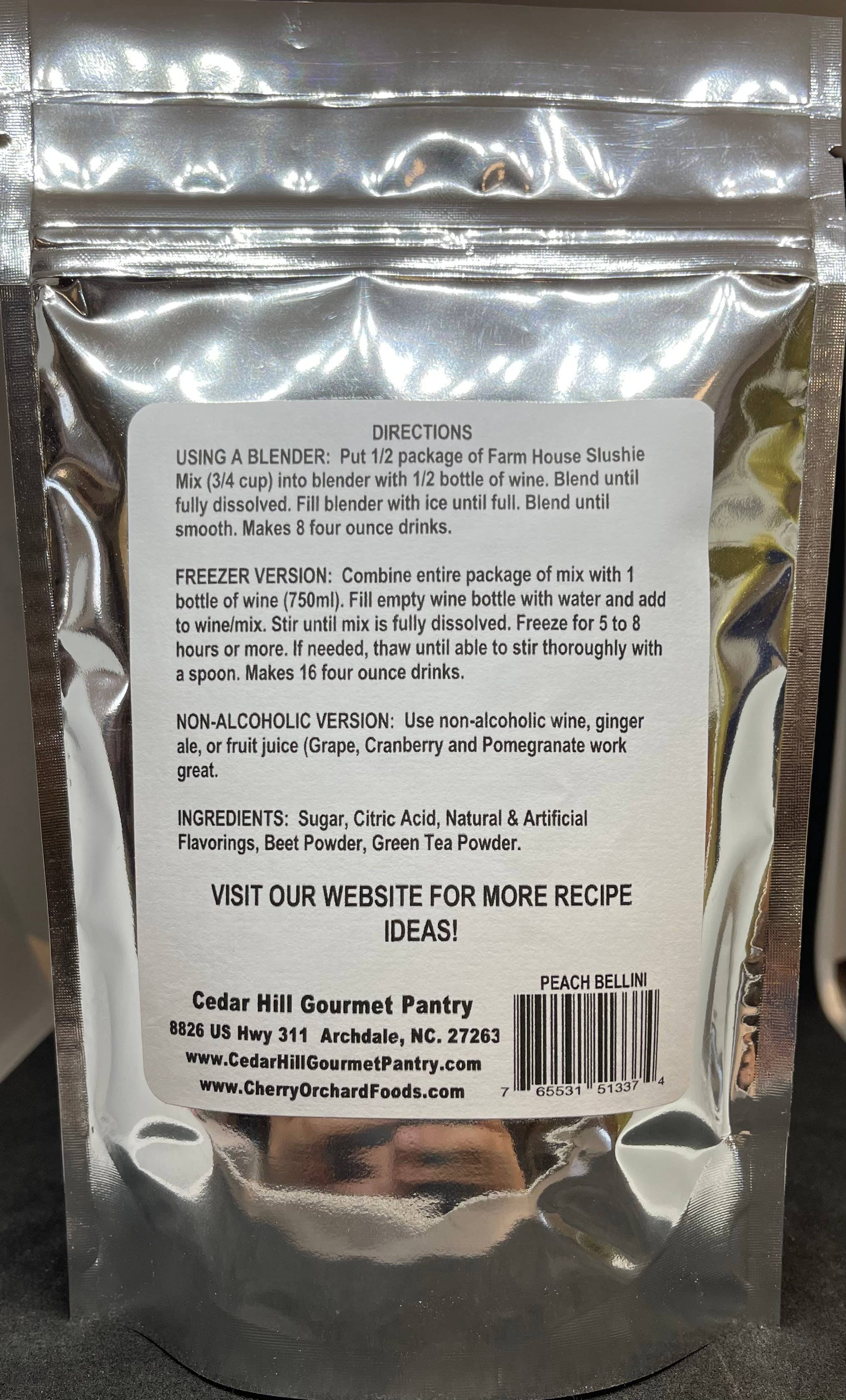 Farm House Slushie Mixes are designed to create refreshing slushies, perfect for a variety of occasions. Available in 12 different flavors including Original, Pina-Colada, Amaretto, Bananas Foster, Mango-Passion, Sour Apple, Berry Delicious, Orange Cream, Tigers Blood, Bahama Mama, and the new additions of Peach Bellini and Mimosa, these mixes offer a diverse selection. Made with pure cane sugar, citric acid, green tea powder, and natural and artificial flavorings, they contain no preservatives or artificial food coloring. The blender version makes 8 four-ounce drinks, while the freezer version produces 16 four-ounce drinks, ideal for parties or gatherings where guests can enjoy flavorful frozen beverages.