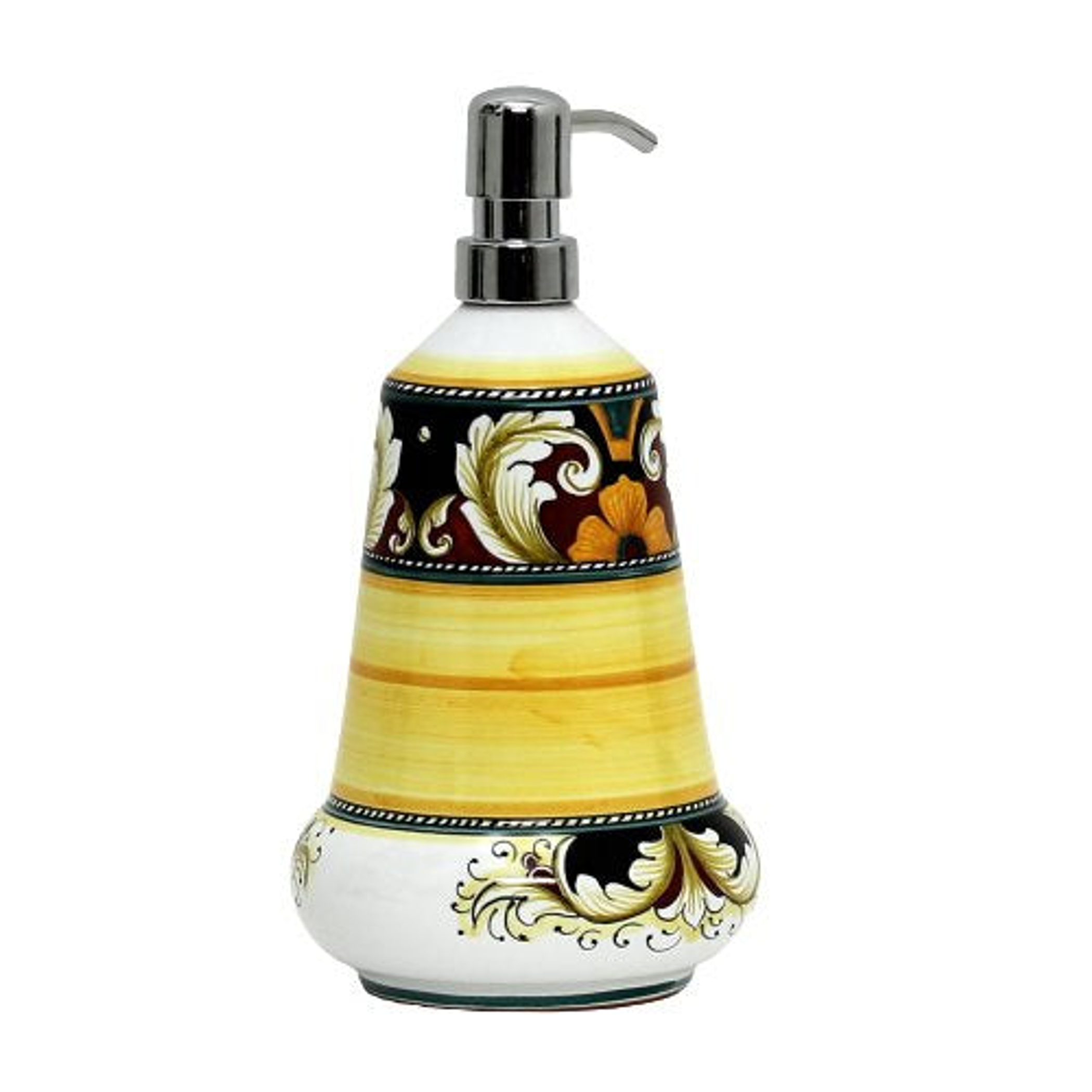 The DERUTA VARIO Liquid Soap Lotion Dispenser is an elegantly crafted ceramic piece that showcases a refined foliage scrollwork design complemented by a bold black background. This dispenser measures 5 inches in diameter and stands 9 inches high, holding up to 26 ounces of liquid soap or lotion. The intricate hand-painted decorations highlight the challenging color shading technique in ceramic art, reflecting over 500 years of artistic tradition from the Italian town of Deruta. Each item is handcrafted, ensuring unique designs with slight variations. This dispenser is ideal for kitchens and bathrooms, adding a touch of sophistication to everyday spaces.