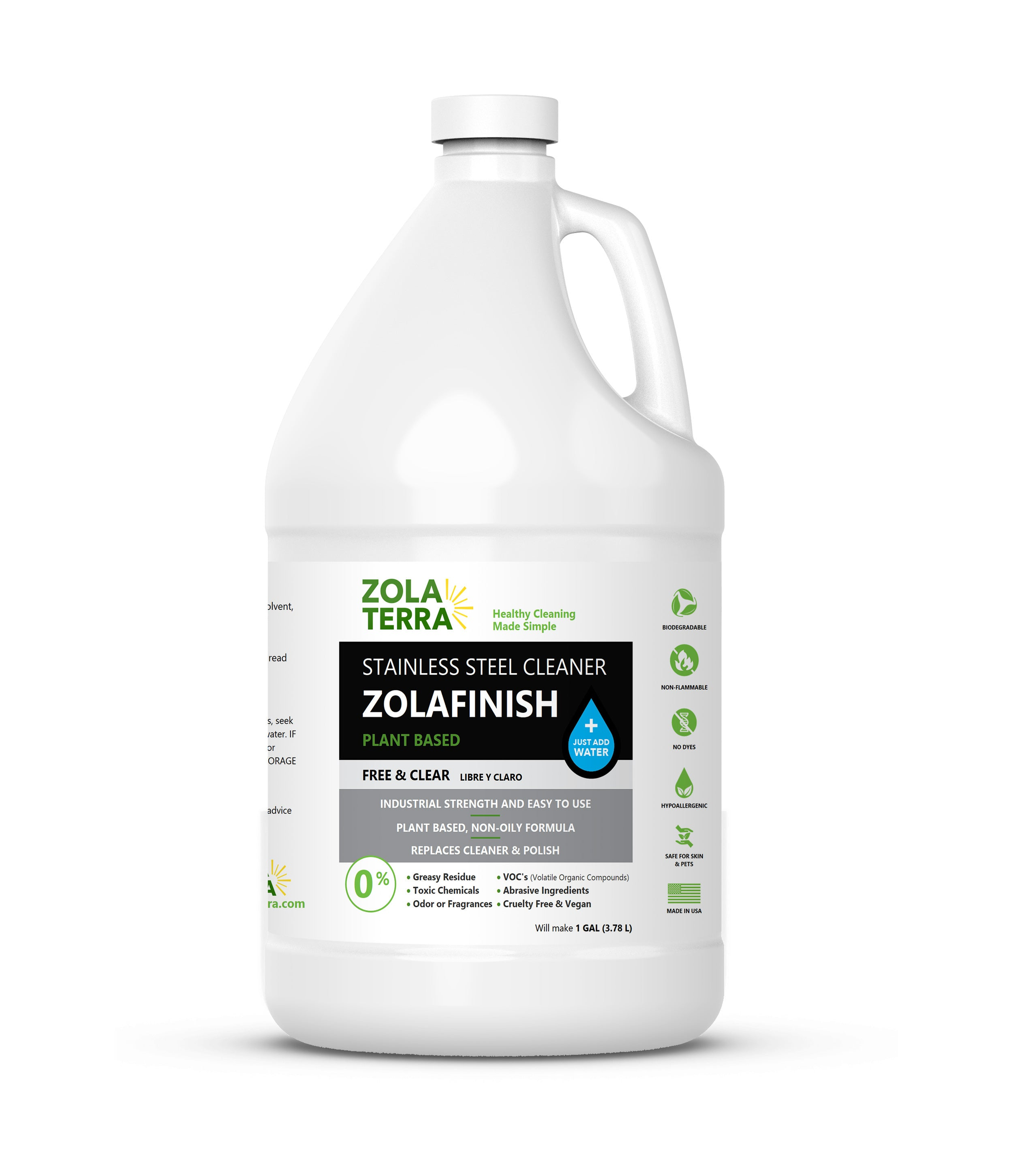 ZolaFinish Stainless Steel Cleaner is a specialized cleaning solution designed to effectively clean and eliminate grease, oil, and odors from stainless steel surfaces. This product comes in a concentrated form where five gallons of concentrate can be mixed with water to produce a ready-to-use cleaner totaling fifty-five gallons. The formula is natural, non-toxic, biodegradable, and safe for use around plants and pets, making it suitable for kitchen environments. ZolaFinish cleans without leaving a greasy residue or collecting airborne lint, and it restores the original finish of stainless steel without requiring additional polishing. It is skin-safe and will not cause burns upon contact.