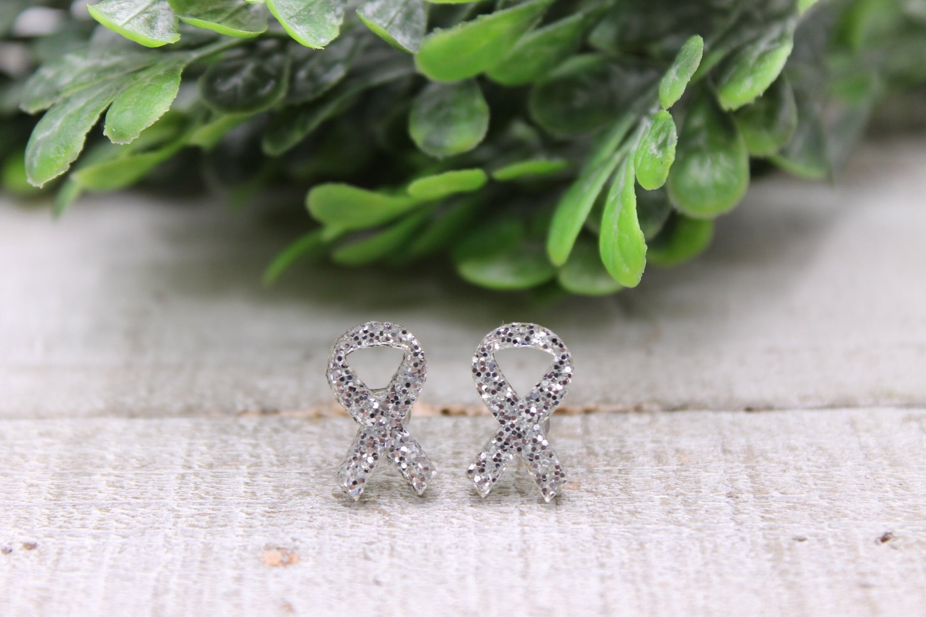 Stud Earrings Silver Glitter Awareness Ribbons 12mm Acrylic Stainless Steel Post Hypoallergenic Handmade