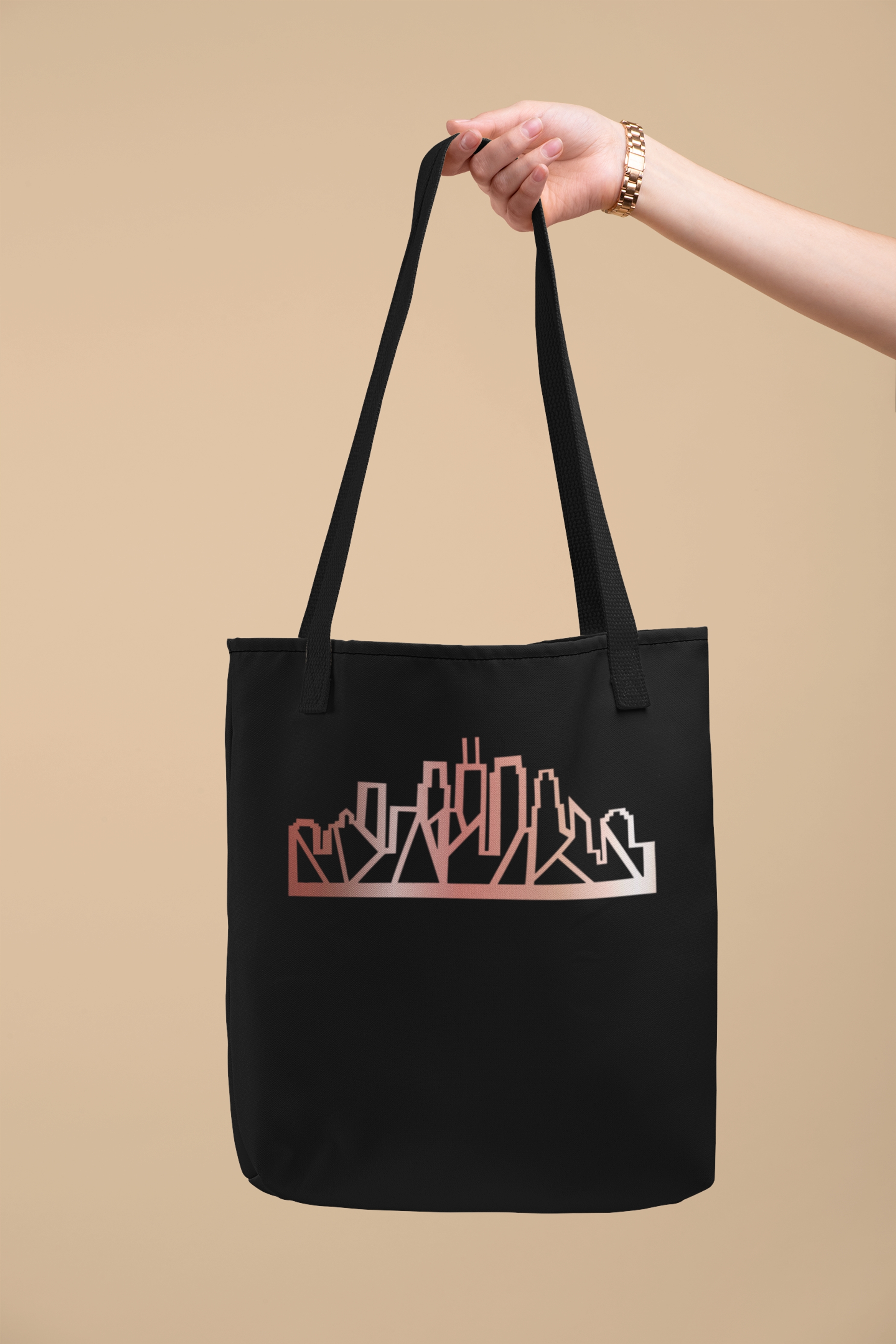 The Chicago Skyline Tote is a versatile grocery tote bag featuring a full side and deep bottom gusset design. It includes matching cotton handles and has reinforced stitching at stress points for added durability. The tote measures 14 inches wide 15 inches high and 4 inches deep making it ideal for carrying groceries or daily essentials. Customers can select from various color options for the skyline design with white and rosegold variations shown. This tote is perfect for shopping trips outings or as an everyday carry-all making it a practical accessory for various activities.