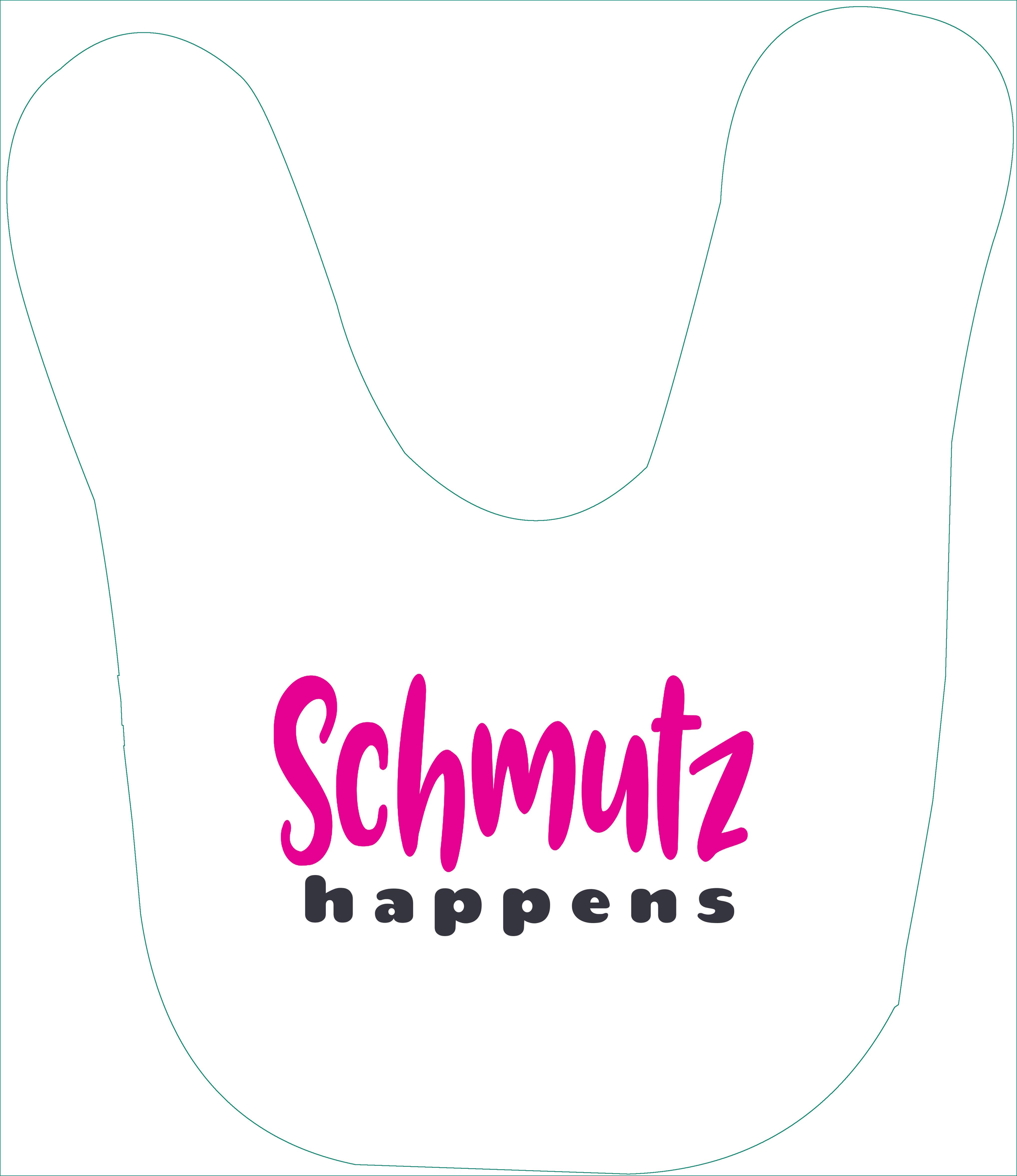 El producto es un babero con el diseño "Schmutz Happens!" que tiene como propósito principal mantener a los bebés limpios durante la hora de comer. Este babero está disponible en materiales de poliéster o de forro polar blanco, y su estampado es realizado con tintas seguras para bebés. Es apto para lavadoras, lo que facilita su limpieza. Cada babero se presenta empaquetado de forma individual en una bolsa de celofán. El modelo de forro polar blanco cuenta con un cierre de velcro, mientras que las versiones en rosa y azul tienen cierres de cuerda. Es un regalo divertido y práctico para baby showers y se utiliza comúnmente en situaciones de alimentación y entretenimiento del bebé.