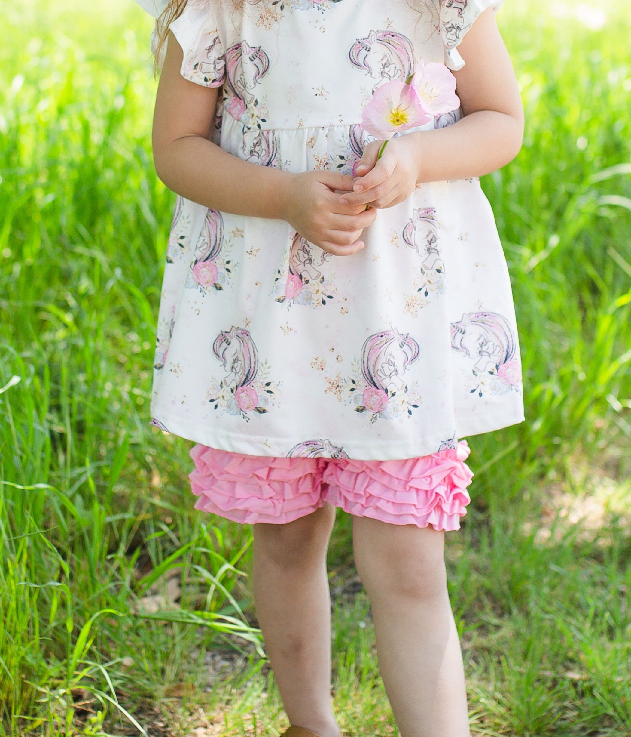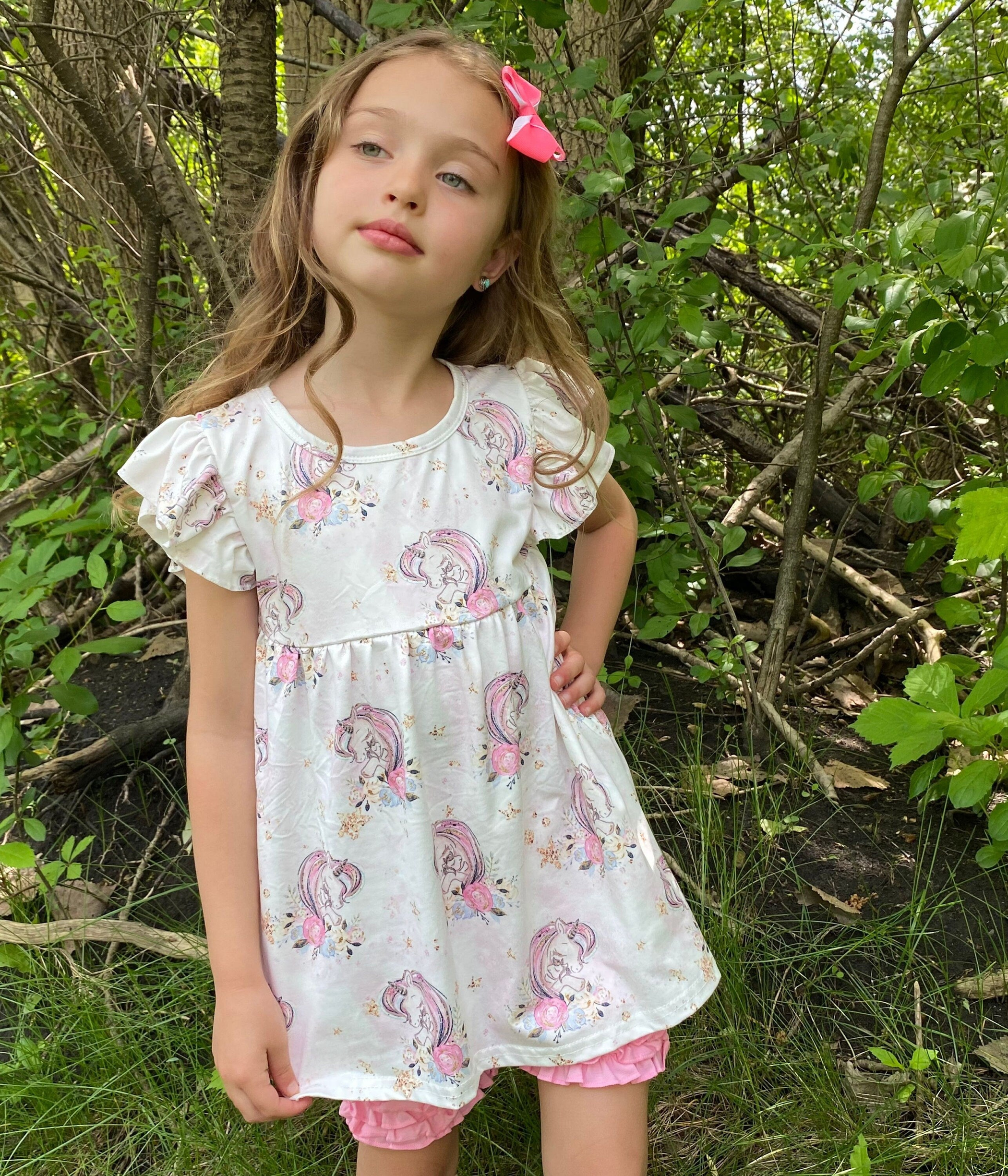 Conjunto de ropa para verano con diseño de unicornio túnica rosa corta con pantalones cortos rizados de seda de leche talla 2 a 9 años