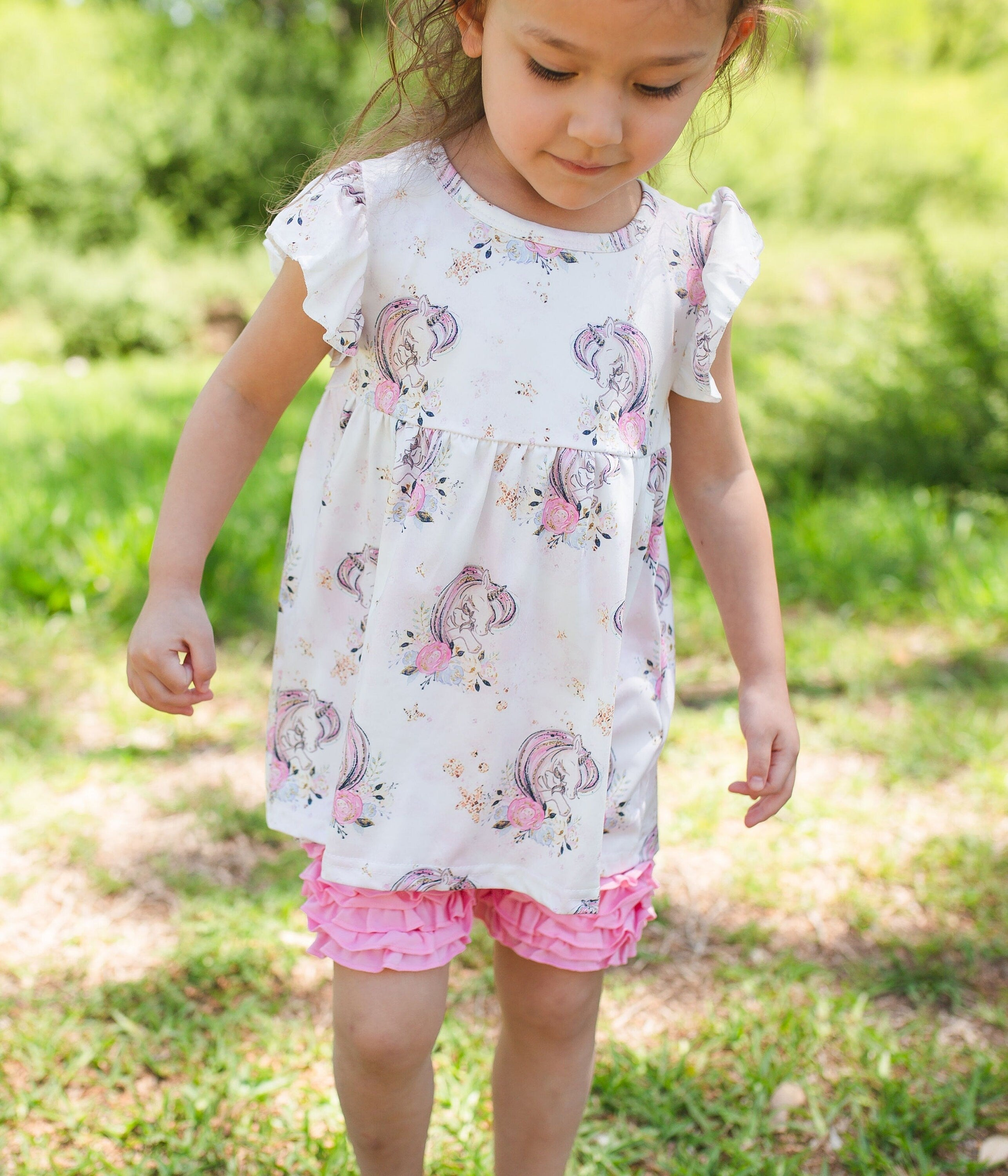 El producto es un conjunto de ropa infantil que incluye un atuendo de verano con temática de unicornios y brillo. Este conjunto presenta una túnica cortita de manga corta con volantes, confeccionada en tela de seda de leche con un estampado de unicornios en color rosa y rosas. Se complementa con un par de pantalones cortos rosa a juego que también presentan detalles con volantes. Este atuendo está disponible en tallas que van desde los 2 hasta los 9 años, siendo ideal para días de juego al aire libre en verano. Es un conjunto diseñado para brindar comodidad y estilo a las actividades infantiles.