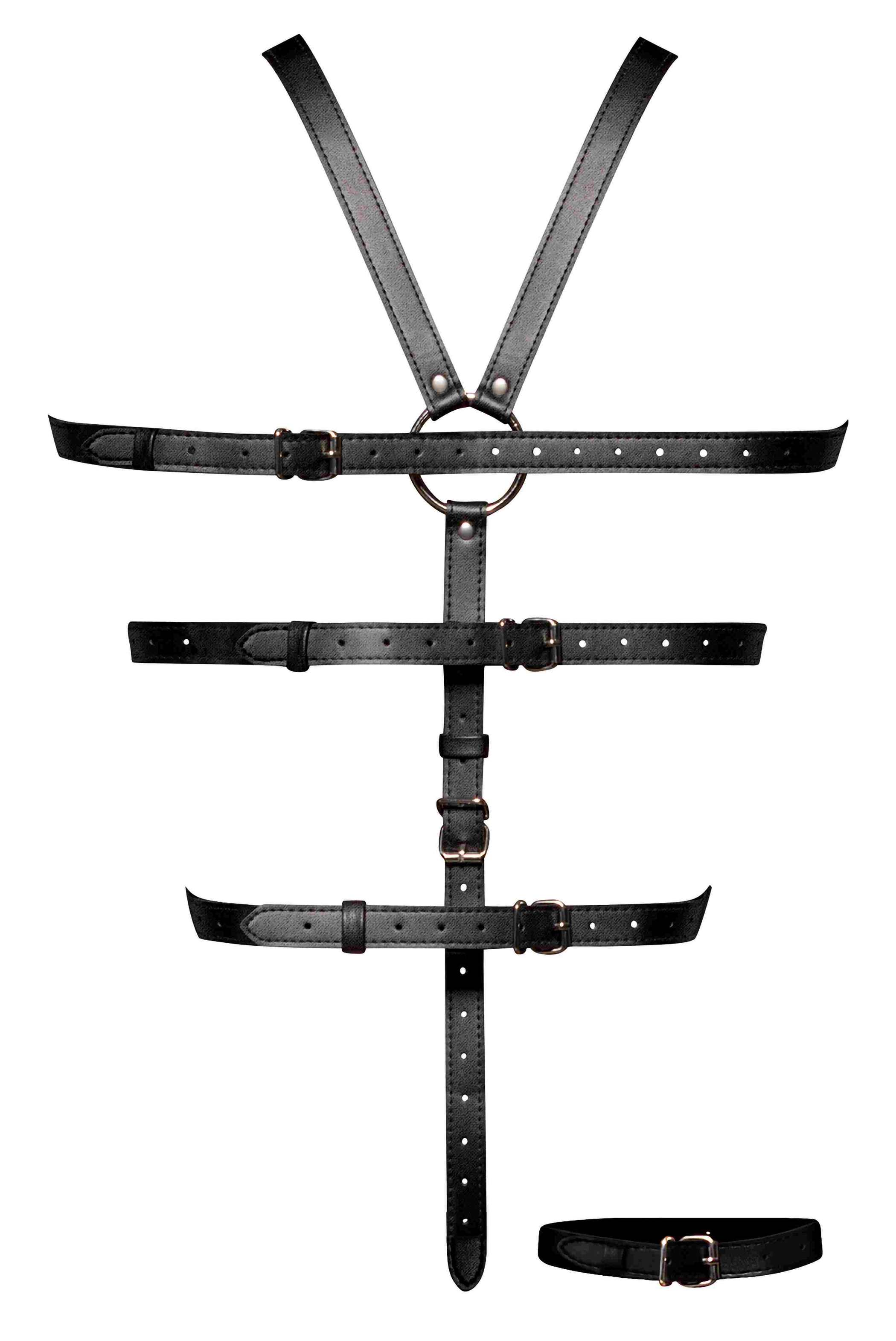 Ellona Tie Me Up 1 Piece Harness Set Black O/S from Male Power Fetish Line. From the women's Leather collection, this style includes a full torso restraint Harness with adjustable buckled back straps and adjustable T-Back with metal rings and studs. Fabric: Soft Nubuck Leather with Polyurethane PU coating, heavy metal rings, buckles, and studding. Polyurethane PU coated Split Leather. Do not wash, Do not Bleach. Do not Tumble dry. Categories: Lingerie, Clothing, Bondage, Fetish, Kink, Naughty Role Play, Bondage Restraints, Body Harnesses. 2023.