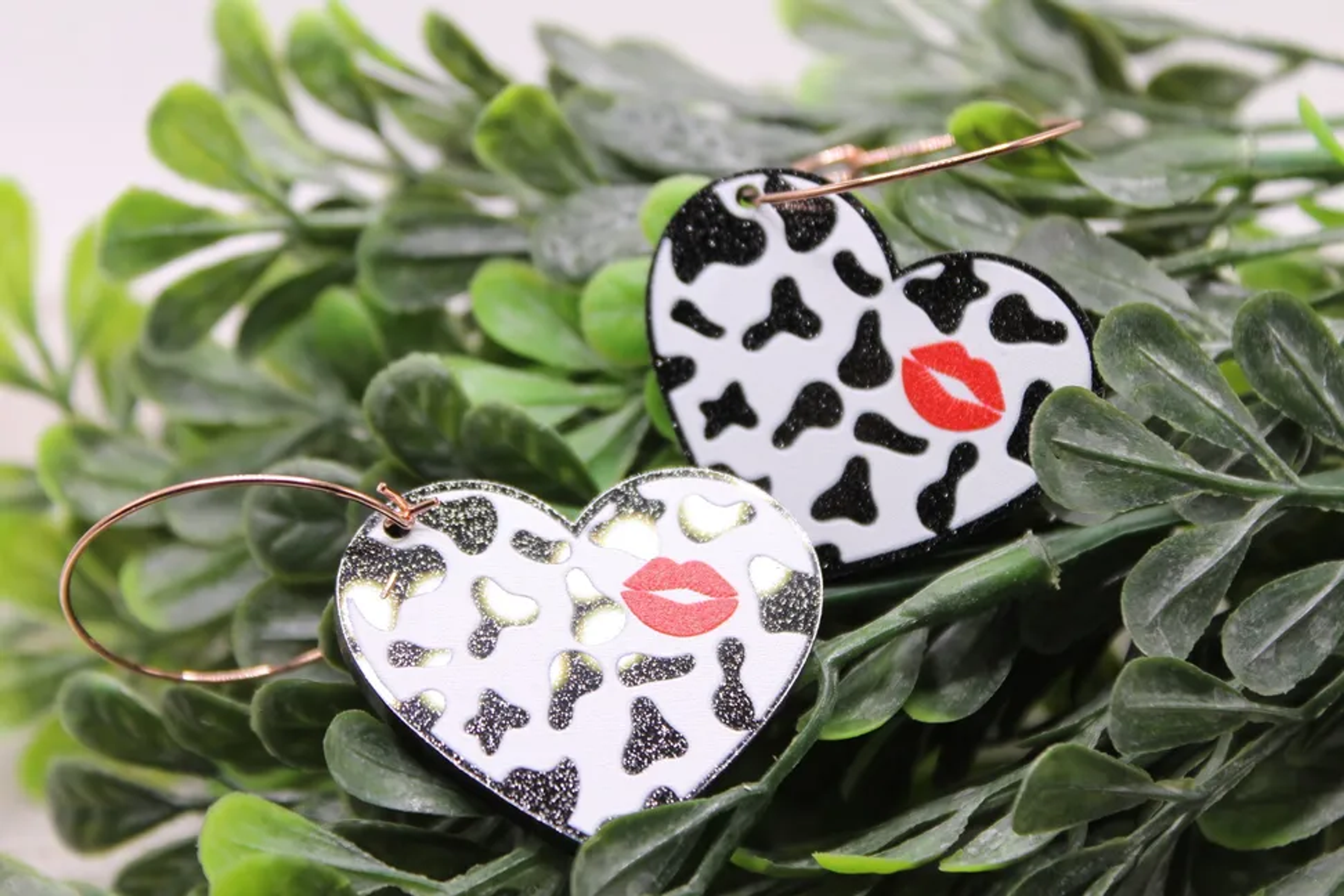 Pendientes aro función principal diseño labios rojos sobre print de vaca material acrílico acero inoxidable hipoalergénico incluye respaldo de goma