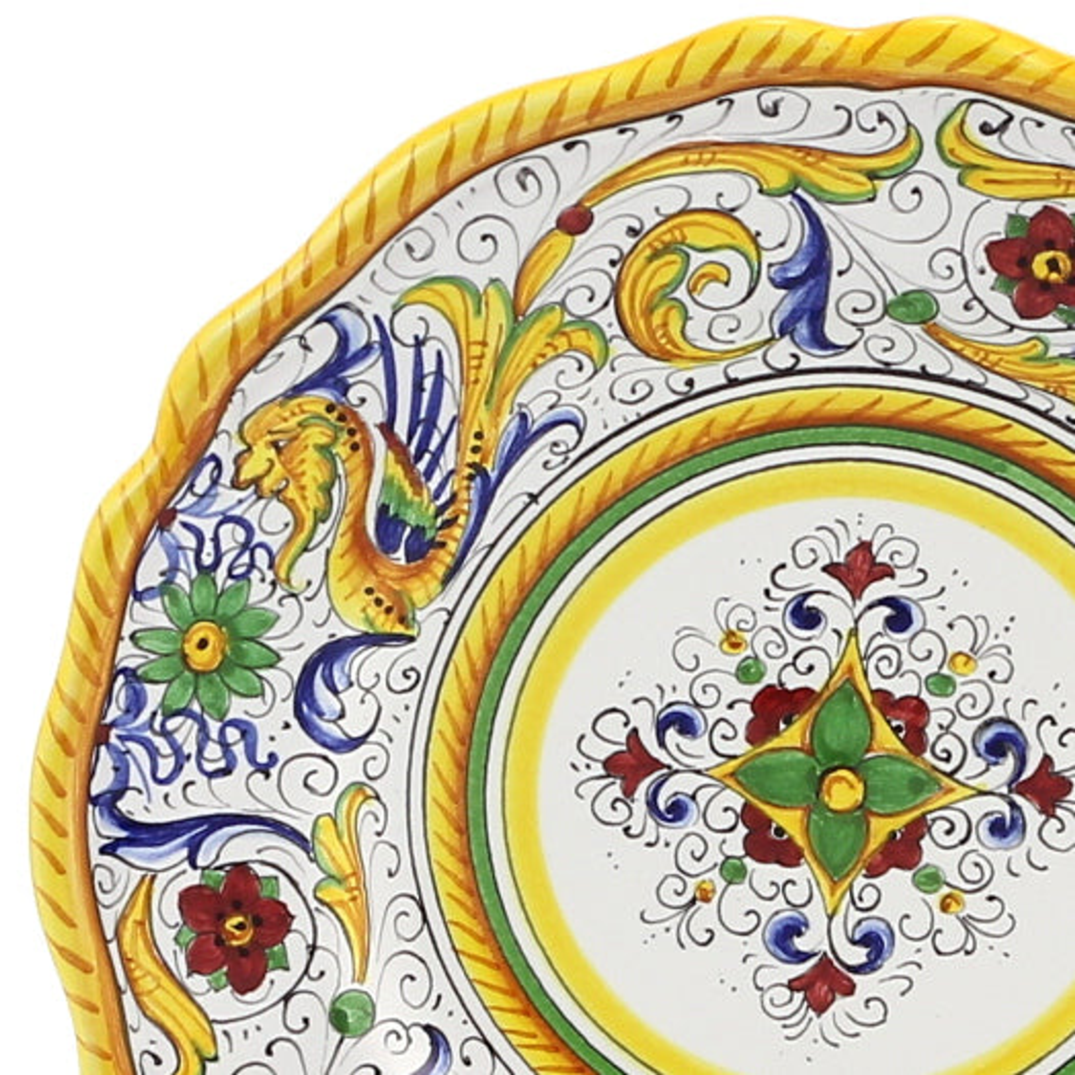 Plato de ensalada de la colección Raffaellesco que representa uno de los patrones de majólica italiana más icónicos y atemporales, con su origen en el siglo XVI. Este plato cuenta con un motivo central que presenta un dragón estilizado, obra que se atribuye al maestro renacentista Rafael. El diseño incluye arabescos que evocan los frescos de Rafael, simbolizando buena fortuna y vientos favorables para los comerciantes marítimos. Fabricado a mano en Deruta, Italia, este plato mide 8 pulgadas de diámetro y es seguro para lavavajillas, aunque no se recomienda su uso en microondas. Los productos de Deruta son libres de plomo y cadmio.